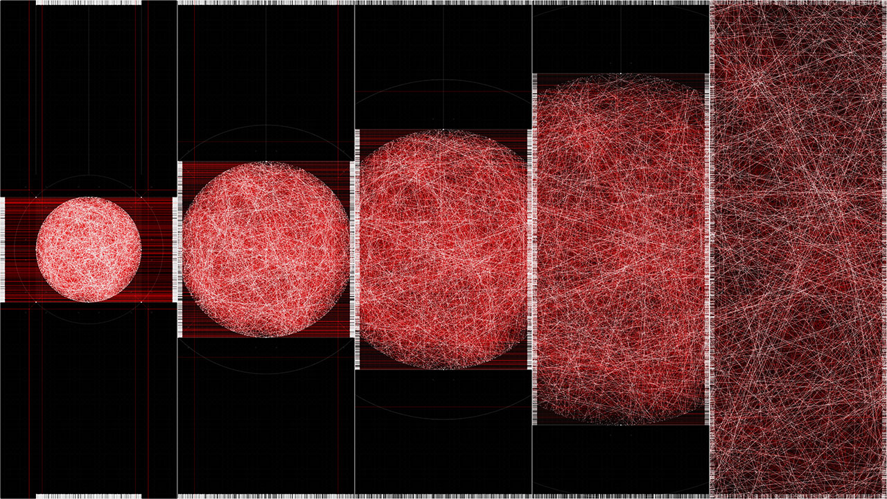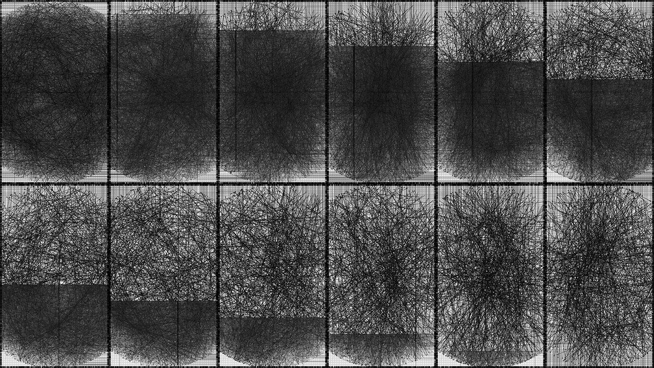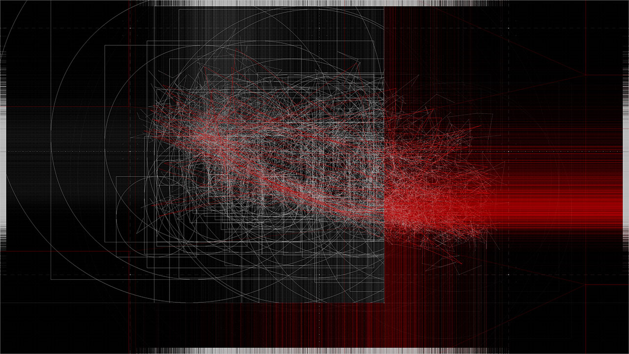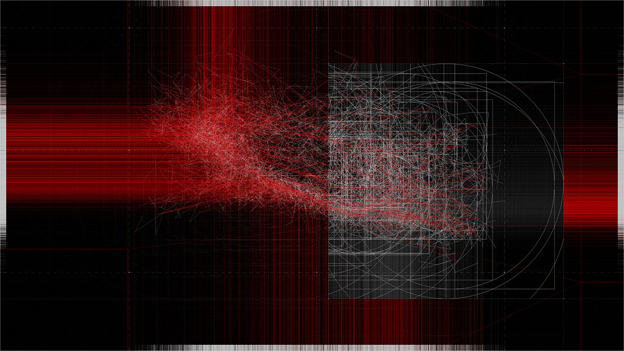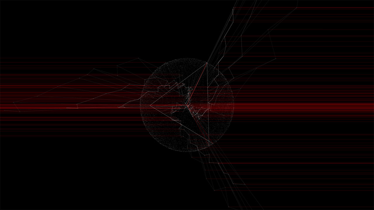 Within the work, a beam of light is reflected ten thousand times through simulated physical interactions. Each reflection point is determined by both algorithmic necessity and stochastic variation, producing a trajectory that is at once inevitable and unpredictable. The resulting line becomes a visual record of interlinked cause and chance.