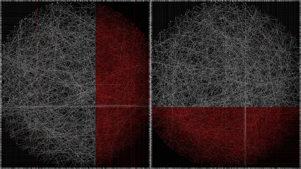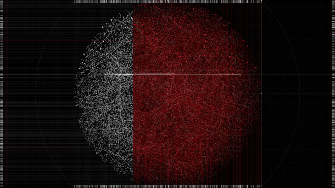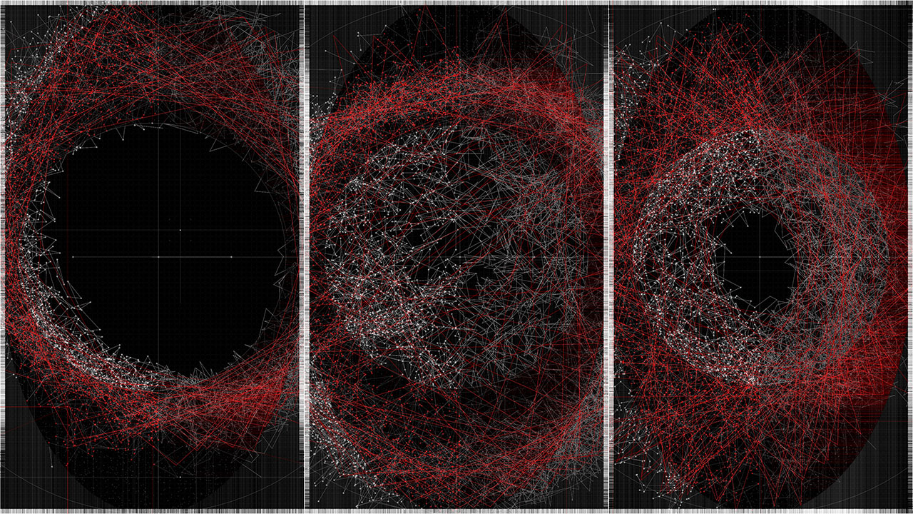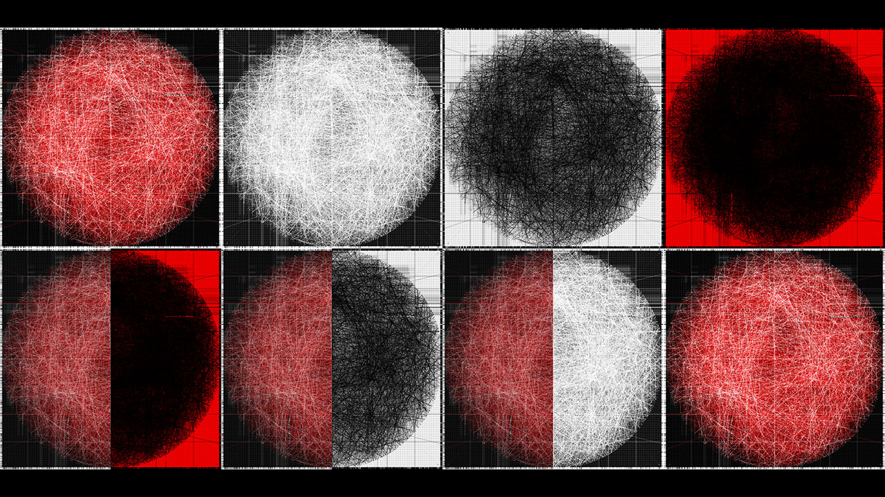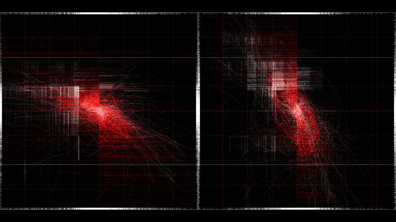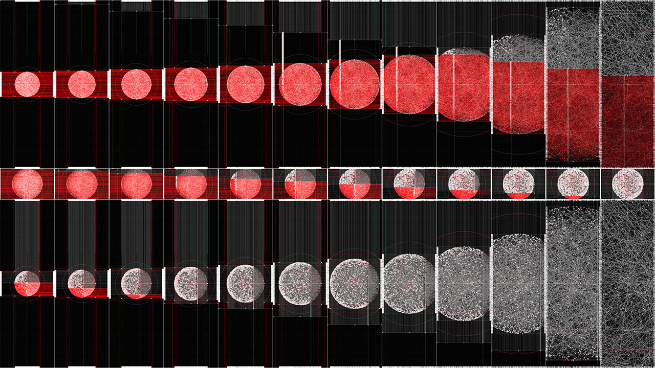Within the work, a beam of light is reflected ten thousand times through simulated physical interactions. Each reflection point is determined by both algorithmic necessity and stochastic variation, producing a trajectory that is at once inevitable and unpredictable. The resulting line becomes a visual record of interlinked cause and chance.