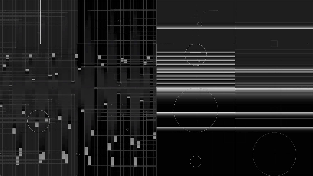 The video language is constructed by using elements such as time, sound waveform, alignment, reconfiguration, algorithmic logic, and physical simulation."