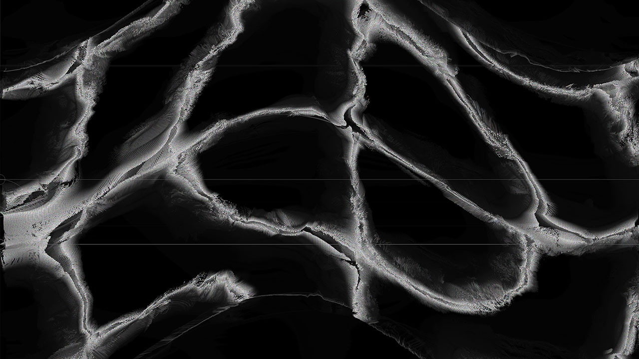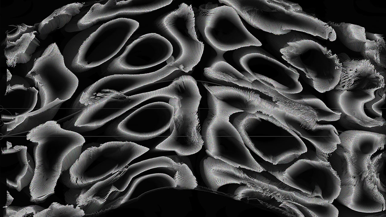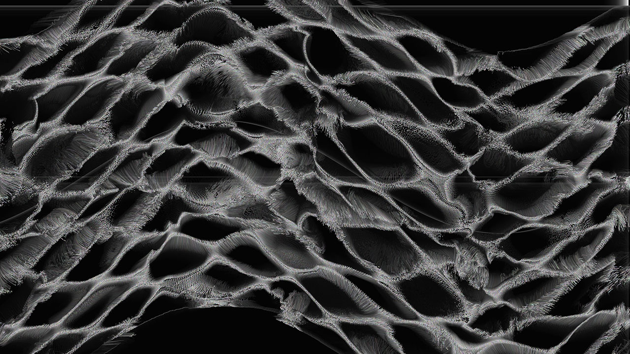 Through a custom algorithm simulating a vibrating plane, the piece generates a constantly evolving visual field of particles that appear to self-organize and reform in response to invisible forces. This dynamic echoes the rhythms and resonances inherent in natural systems.