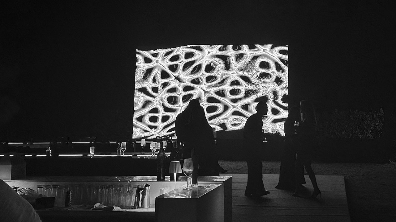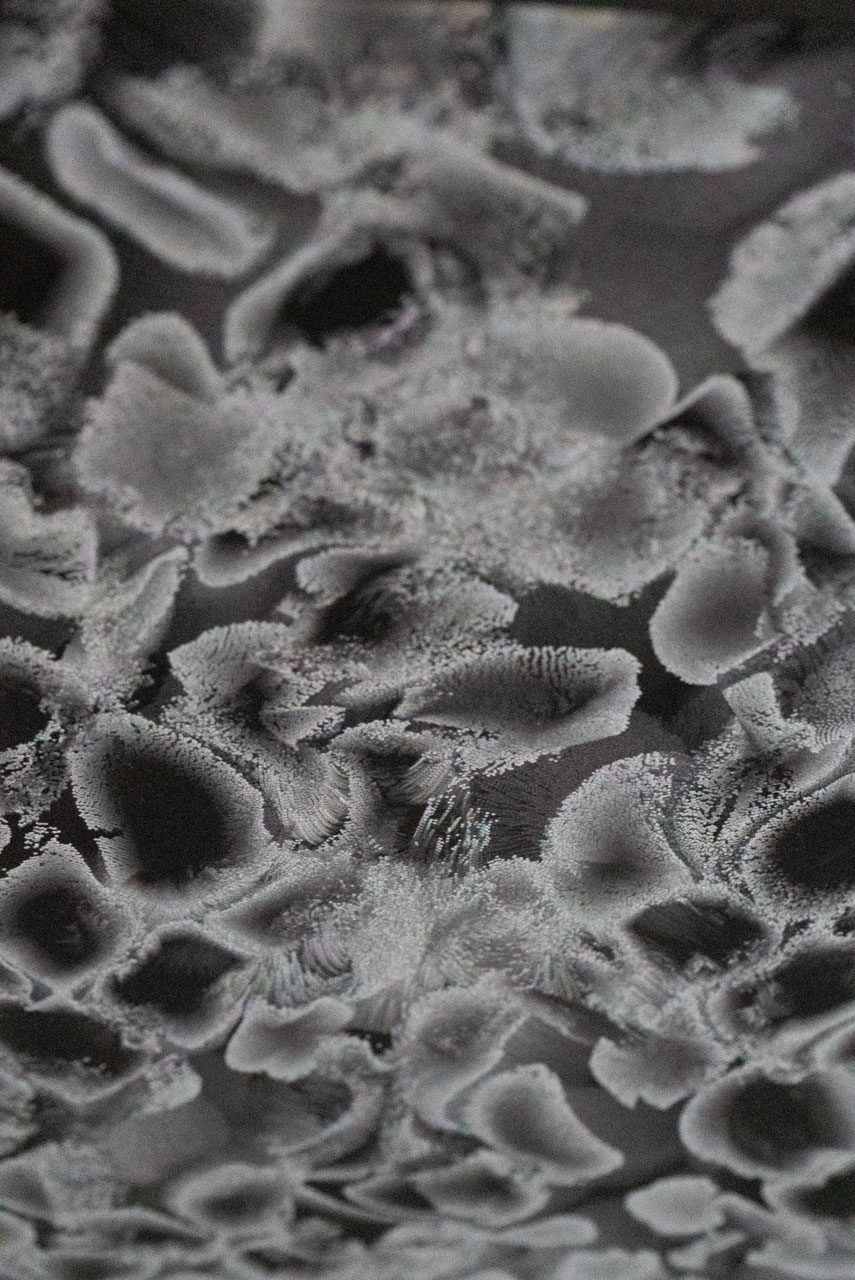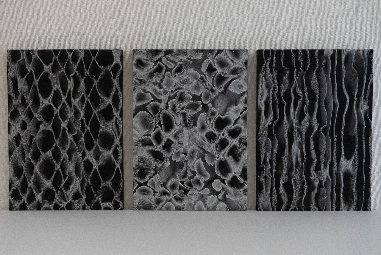 Plate is an installation that visualizes the invisible relationship between vibration and particles, drawing from the scientific and poetic principles of cymatics. The artwork portrays the emergence and dissolution of structure as a continuous, dynamic phenomenon — a metaphor for both physical transformation and perceptual fluidity.