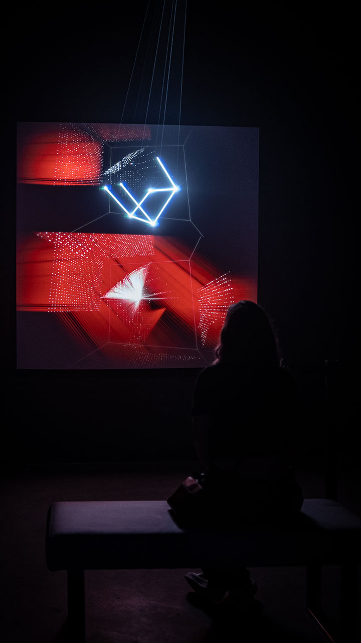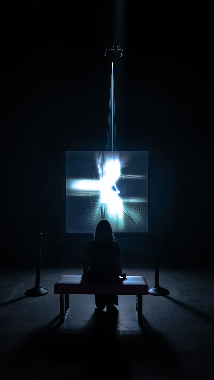 The reflection data and the cube drawn by the laser are always linked in real time. Also, the depth of the cube and visuals is the same structure as visual depth information obtained from real world depths. The intangible cube provides the different viewpoints to audiences autonomy and dynamically.